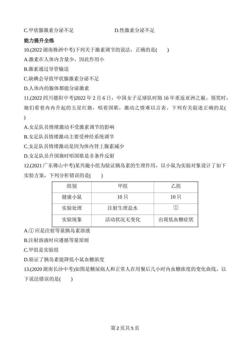 【七年级下册生物北师大版】4.12.3 激素调节 同步练习.docx_第2页