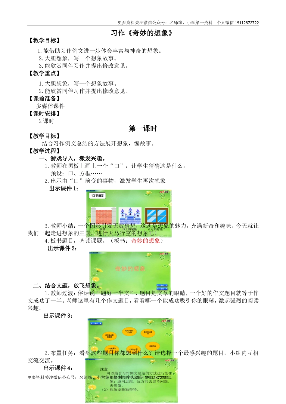 更多资料关注微信公众号:名师缘、小学第一资料个人微信19112872722习作《奇妙的想象》【教学目标】1.能借助习作例文进一步体会丰富与神奇的想象。2.大胆想象,写一个想象故事。3.能欣赏同伴习作并提出修改意见。...
