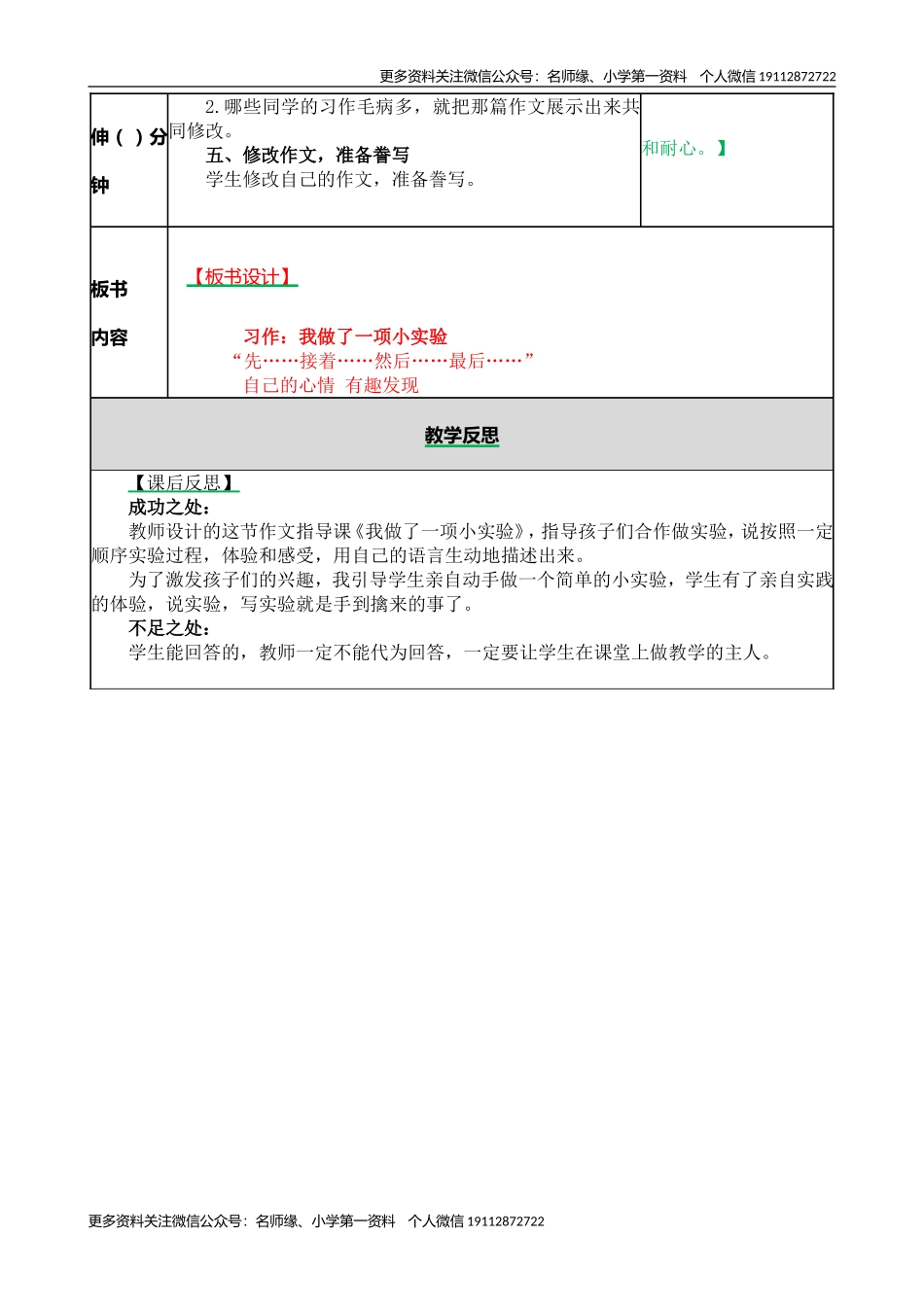 更多资料关注微信公众号:名师缘、小学第一资料个人微信19112872722课题我做了一项小实验课型习作授课时间1课时教学目标1.运用“先……接着……然后……最后……”这样表示顺序的词语进行有条理的表达,把实验过...