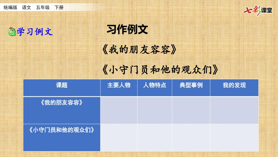 统编版语文五年级下册习作:形形色色的人统编版语文五年级下册习作例文《我的朋友容容》《小守门员和他的观众们》学习例文课题主要人物人物特点典型事例我的发现《我的朋友容容》《小守门员和他的观众们》统编版...