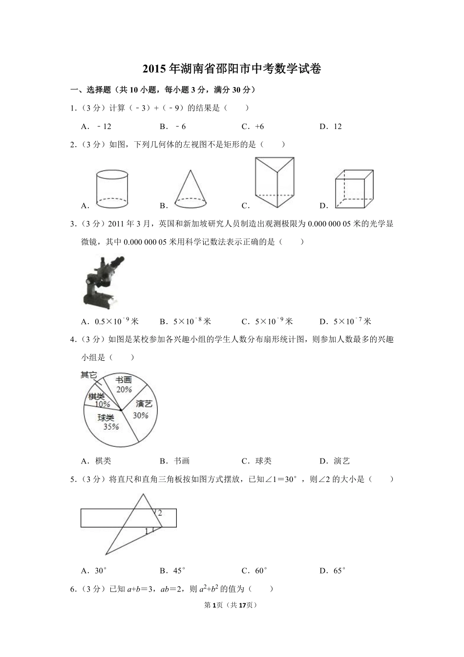 第1页(共17页)2015年湖南省邵阳市中考数学试卷一、选择题(共10小题,每小题3分,满分30分)1.(3分)计算(﹣3)+(﹣9)的结果是()A.﹣12B.﹣6C.+6D.122.(3分)如图,下列几何体的左视图不是矩形的...