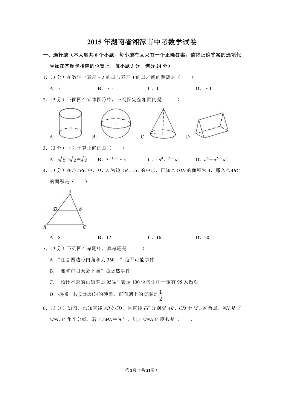 2015年湖南省湘潭市中考数学试卷(含解析版).pdf