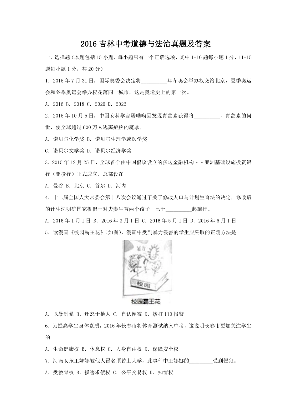 2016吉林中考道德与法治真题及答案一、选择题(本题包括15小题,每小题只有一个正确选项,其中1-10题每小题1分,11-15题每小题1分,共20分)1.2015年7月31日,国际奥委会决定将__________年冬奥会举办权交给北京...