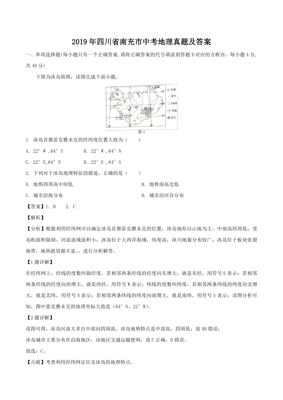2019年四川省南充市中考地理真题及答案一、单项选择题(每小题只有一个正确答案,请将正确答案的代号填涂到答题卡对应的方框内。每小题4分,共48分)下图为冰岛简图,读图完成下面小题。1.冰岛首都雷克雅未克的经纬度...