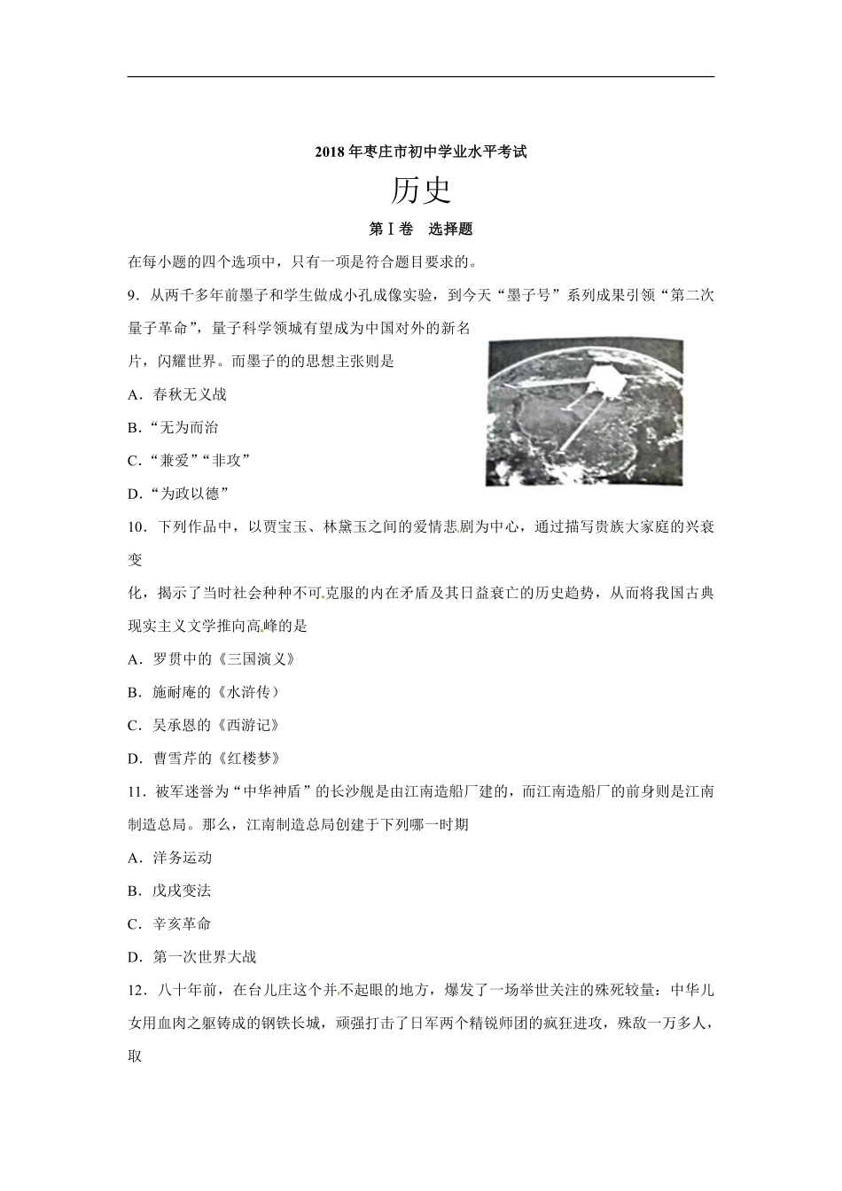2018年枣庄市初中学业水平考试历史第Ⅰ卷选择题在每小题的四个选项中,只有一项是符合题目要求的。9.从两千多年前墨子和学生做成小孔成像实验,到今天“墨子号”系列成果引领“第二次量子革命”,量子科学领城有...
