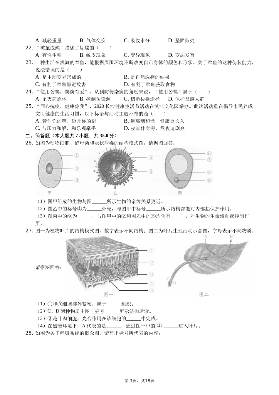 2020年长沙市中考生物试题和答案.docx_第3页