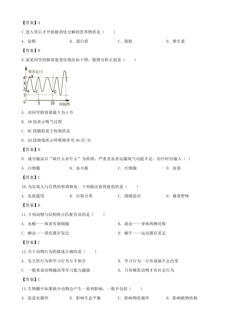 2020年湖南岳阳中考生物试题及答案.pdf