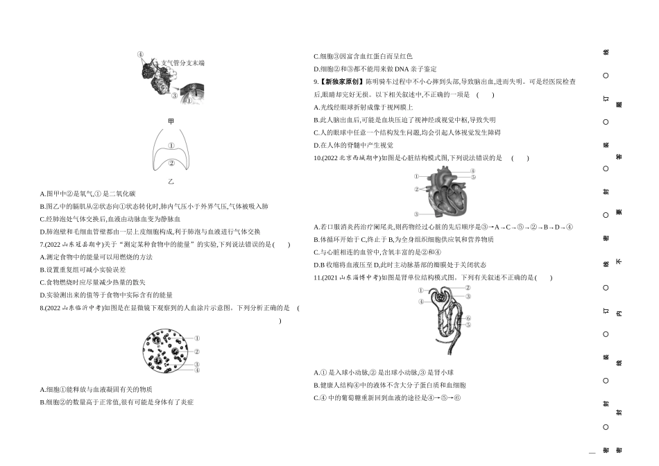 姓名班级考号密○封○装○订○线密○封○装○订○线密封线内不要答题期末素养综合测试(二)满分100分,限时60分钟一、选择题(每小题2分,共40分)1.(2022浙江宁波中考)2022年4月26日,中国营养学会发布了《中国居民膳...
