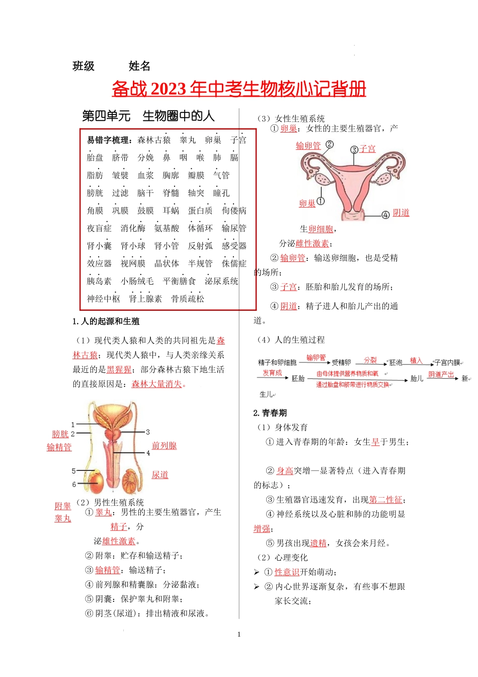 班级姓名备战2023年中考生物核心记背册第四单元生物圈中的人易错字梳理:森林古猿睾丸卵巢子宫胎盘脐带分娩鼻咽喉肺膈脂肪皱襞血浆胸廓瓣膜气管膀胱过滤脑干脊髓轴突瞳孔角膜巩膜鼓膜耳蜗蛋白质佝偻病夜盲症消化...