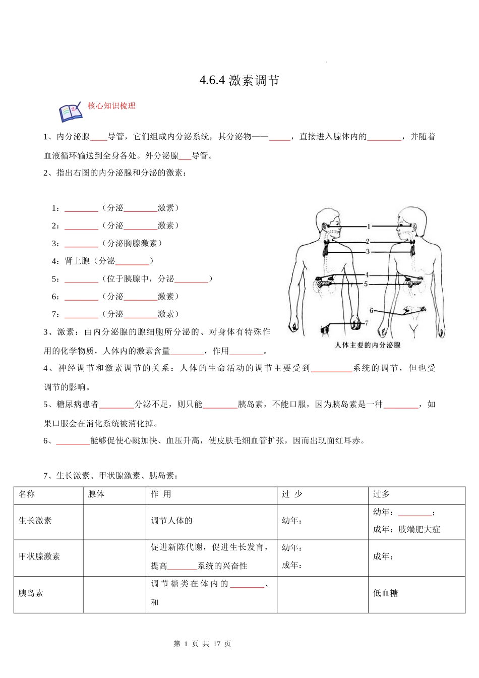 第1页共17页核心知识梳理4.6.4激素调节1、内分泌腺导管,它们组成内分泌系统,其分泌物——,直接进入腺体内的,并随着血液循环输送到全身各处。外分泌腺导管。2、指出右图的内分泌腺和分泌的激素:1:(分泌激素...