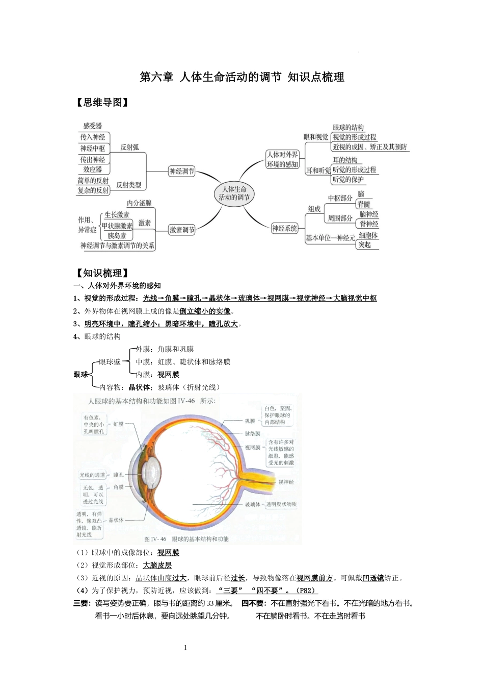 1第六章人体生命活动的调节知识点梳理【思维导图】【知识梳理】一、人体对外界环境的感知1、视觉的形成过程:光线→角膜→瞳孔→晶状体→玻璃体→视网膜→视觉神经→大脑视觉中枢2、外界物体在视网膜上成的像是倒...