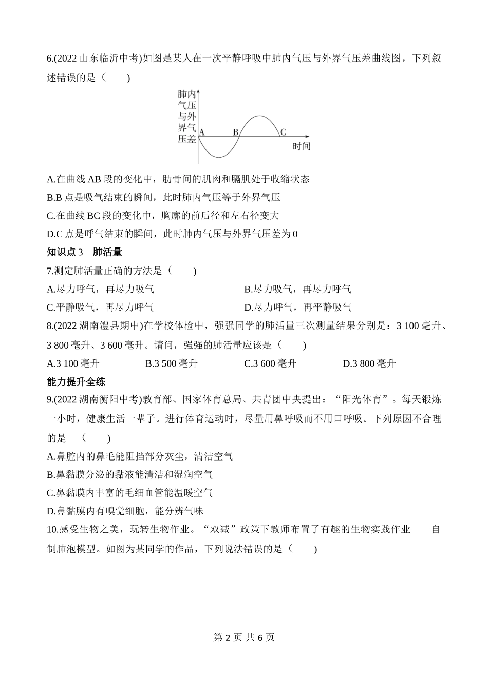 【七年级下册生物苏教版】4.10.3 人体和外界环境的气体交换 同步练习.docx_第2页