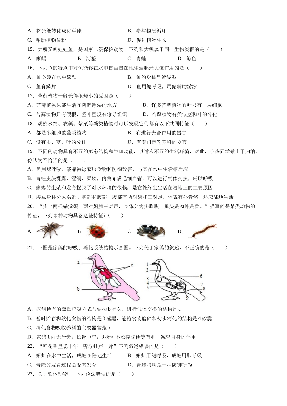 苏科版七年级下学期生物期末测试卷02(考试时间:60分钟试卷满分:100分)一、本题共25小题,每小题2分,共50分。在每小题的四个选项中,选出最符合题目要求的一项。1.生物分类是研究生物的一种基本方法。下列有...
