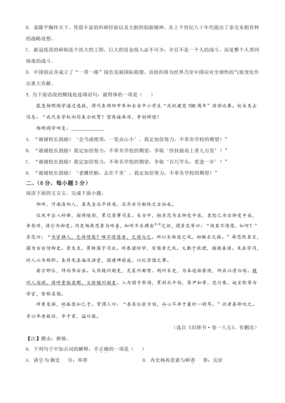 精品解析:四川省绵阳市2021年中考语文试题(原卷版).pdf_第2页