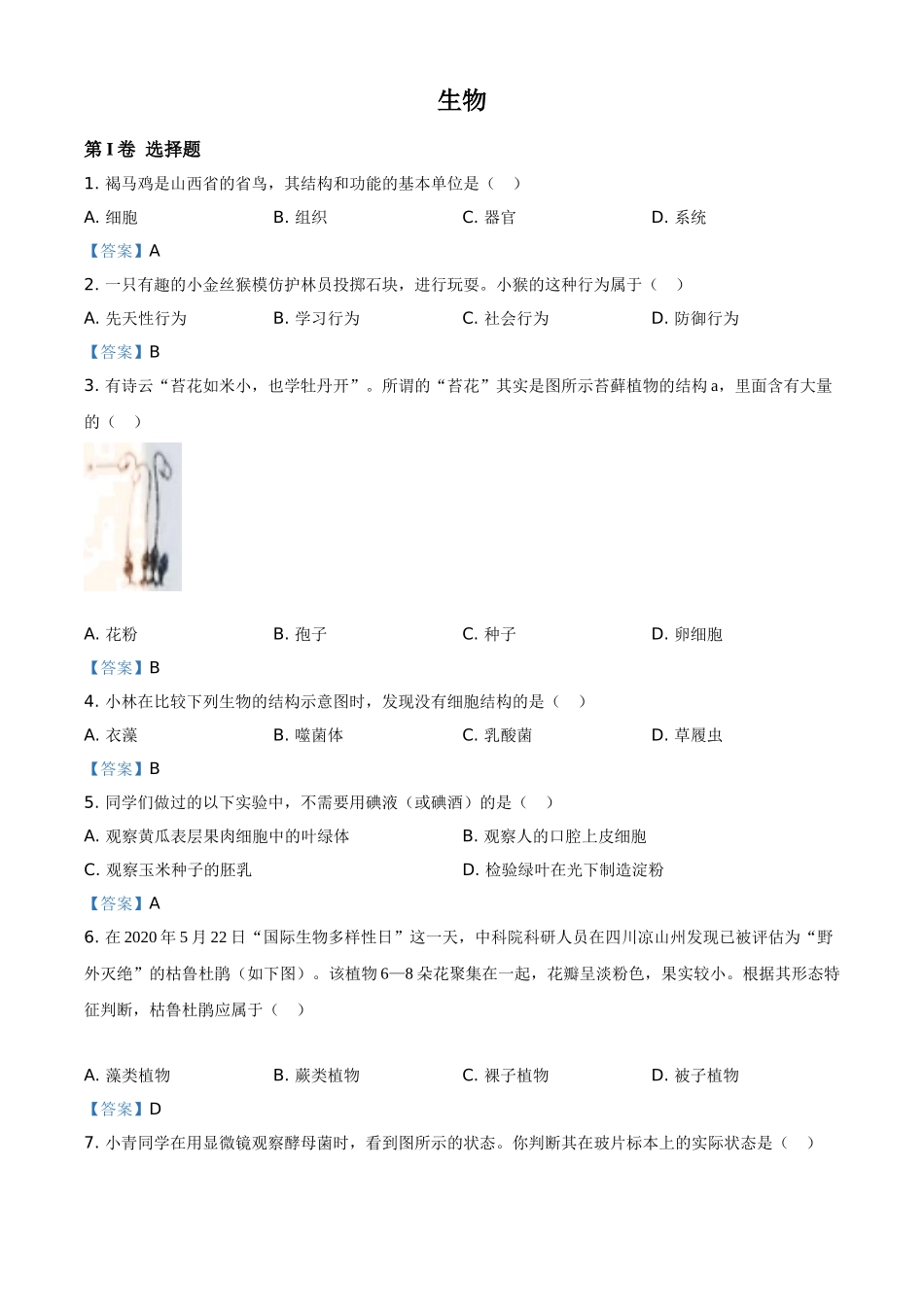 生物第I卷选择题1.褐马鸡是山西省的省鸟,其结构和功能的基本单位是()A.细胞B.组织C.器官D.系统【答案】A2.一只有趣的小金丝猴模仿护林员投掷石块,进行玩耍。小猴的这种行为属于()A.先天性行为B.学习行为C....
