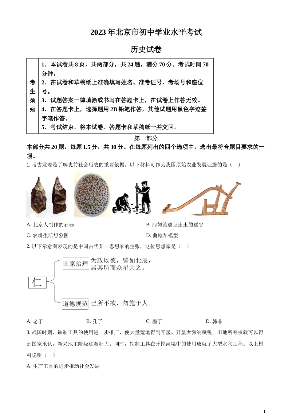 2023年北京市初中学业水平考试历史试卷考生须知1.本试卷共8页,共两部分,共24题,满分70分。考试时间70分钟。2.在试卷和草稿纸上准确填写姓名、准考证号、考场号和座位号。3.试题答案一律填涂或书写在答题卡...