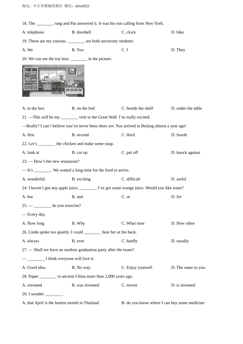 淘宝:中小学教辅资源店微信:mlxt2022平凉市2022年初中毕业与高中阶段招生考试英语试卷考生注意:本试卷含听力,满分为150分,考试时间为120分钟。所有试题均在答题卡上作答,否则无效。听力部分I.听力理解(分4...