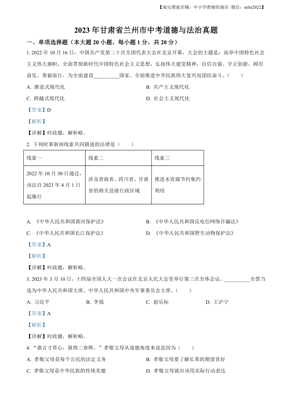 【淘宝搜索店铺:中小学教辅资源店微信:mlxt2022】2023年甘肃省兰州市中考道德与法治真题一、单项选择题(本大题20小题,每小题1分,共20分)1.2022年10月16日,中国共产党第二十次全国代表大会在北京开幕,大会...
