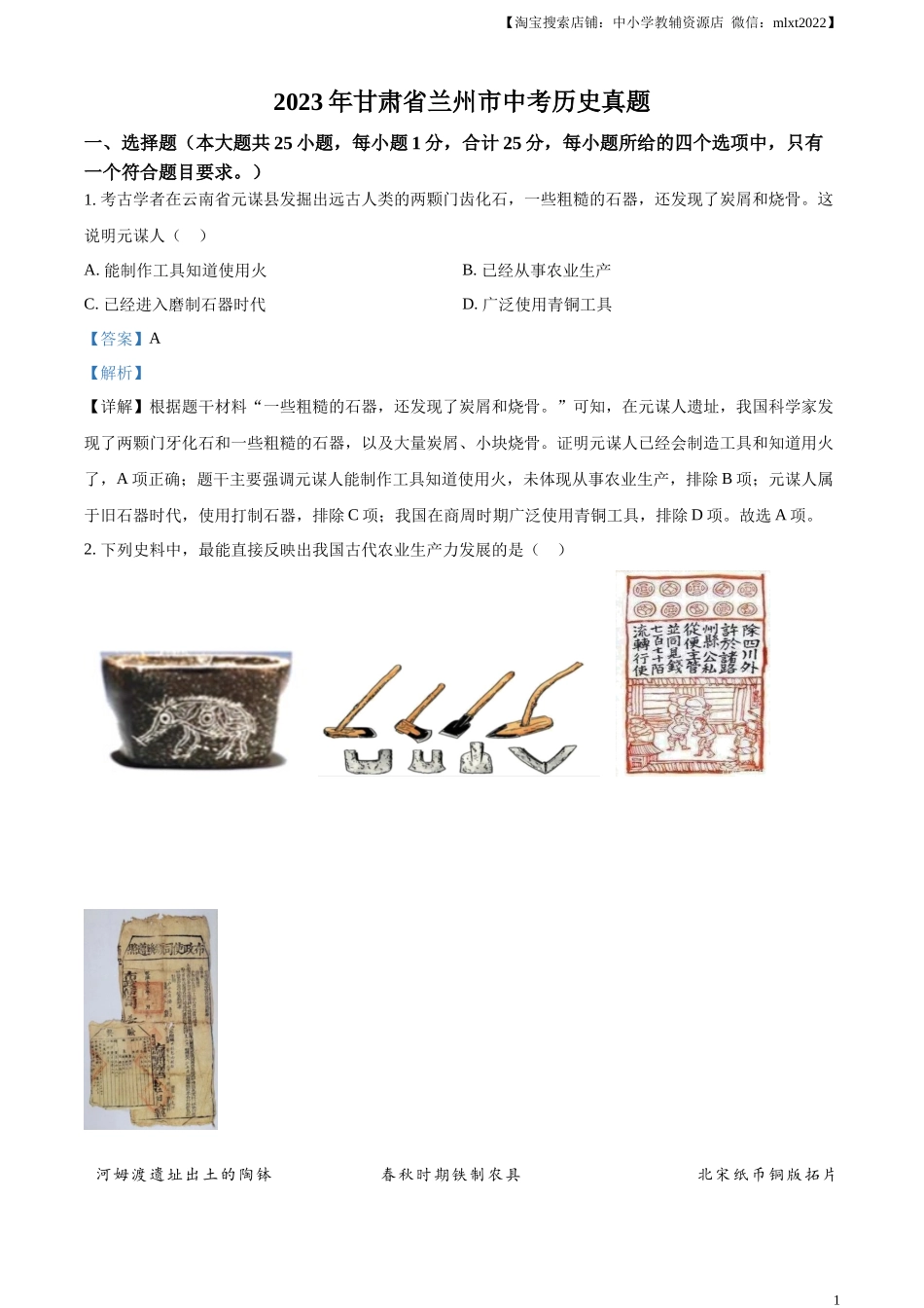 【淘宝搜索店铺:中小学教辅资源店微信:mlxt2022】2023年甘肃省兰州市中考历史真题一、选择题(本大题共25小题,每小题1分,合计25分,每小题所给的四个选项中,只有一个符合题目要求。)1.考古学者在云南省元谋...
