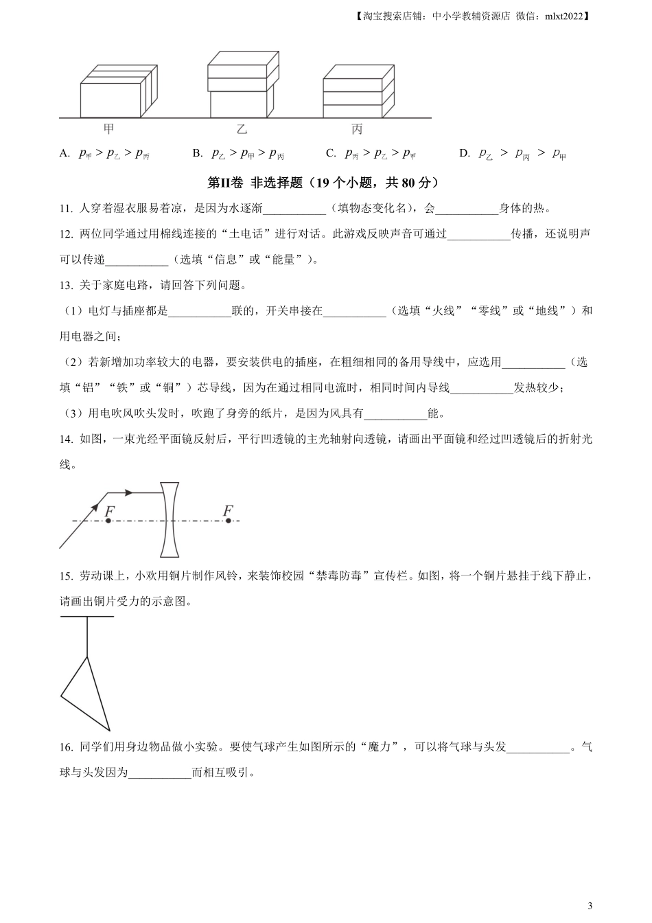 【淘宝搜索店铺:中小学教辅资源店微信:mlxt2022】12023年恩施州初中学业水平考试物理试题卷本试题卷共8页,全卷满分120分,考试用时120分钟。★祝考试顺利★注意事项:1.考生答题全部在答题卷上,答在试题卷上...