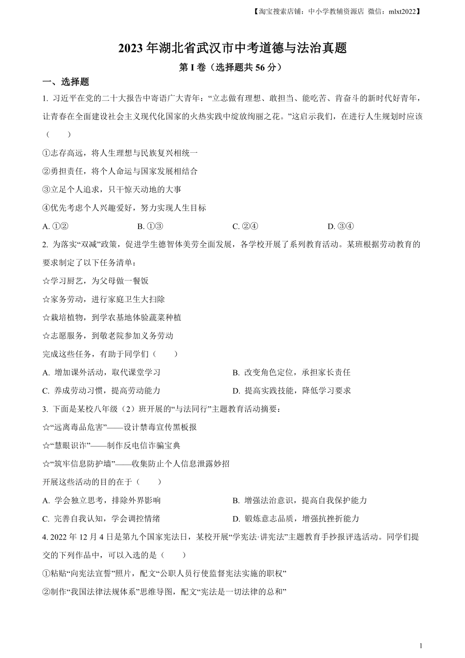 精品解析:2023年湖北省武汉市中考道德与法治真题(原卷版)(1).pdf_第1页