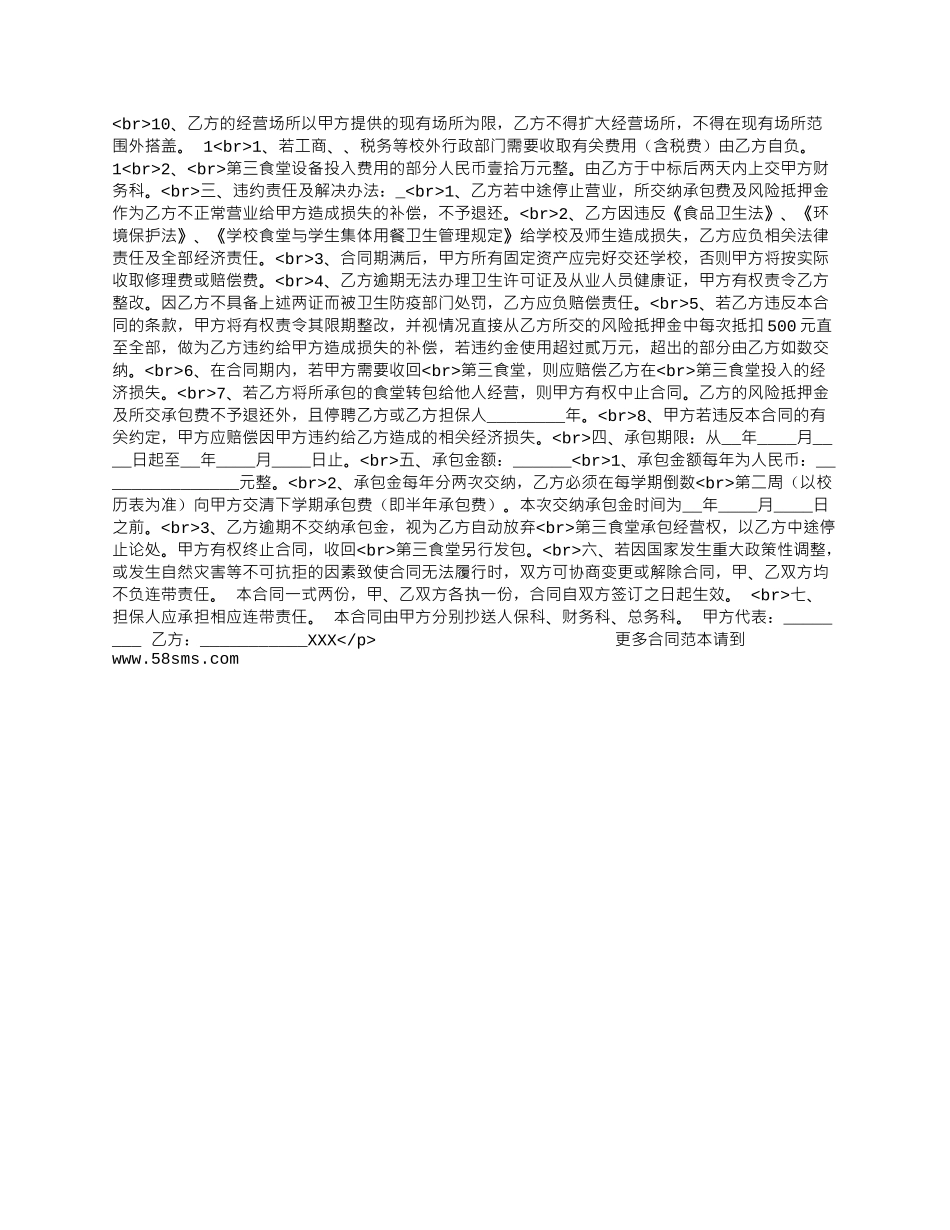 甲方:____省侨兴轻工学校乙方:___________甲、乙方经充分协商后签订本合同,双方应共同遵守,严格执行,以保证办好食堂,服务广大师生。具体合同条款如下:____