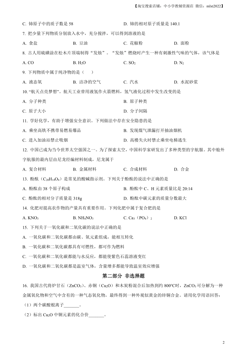 【淘宝搜索店铺:中小学教辅资源店微信:mlxt2022】12023年初中毕业生毕业升学考试化学试卷相对原子质量:H-1C-12O-16Ca-40第一部分择题(本部分共15道小题,每小题只有一个正确选项:其中1~10小题每小题1分,11~...