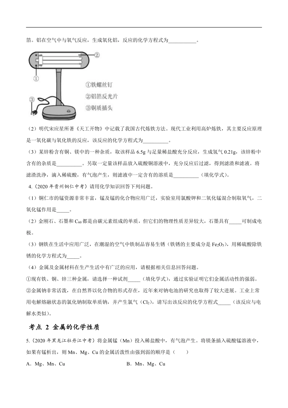 专题11 金属和金属矿物-2020年中考真题化学分项汇编(原卷版).pdf_第3页