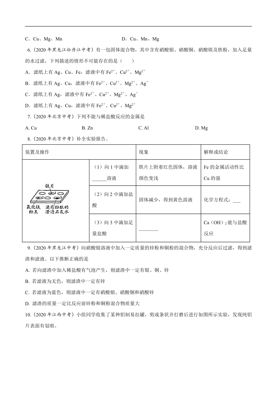 专题11 金属和金属矿物-2020年中考真题化学分项汇编(原卷版).pdf