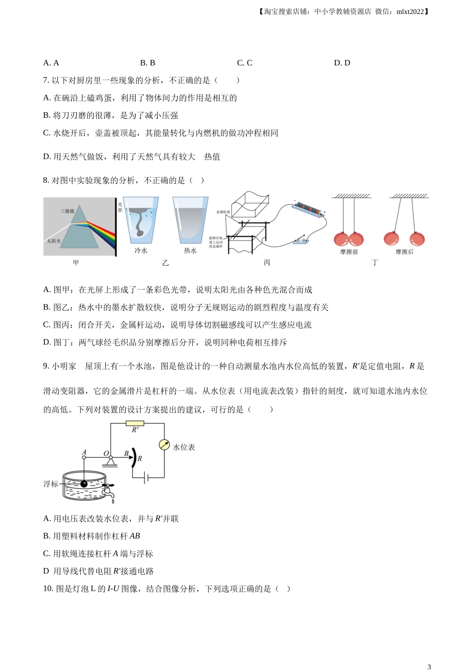 【淘宝搜索店铺:中小学教辅资源店微信:mlxt2022】济宁市二○二三年初中学业水平考试物理试题一、选择题:下列各题的四个选项中,只有一项符合题意,每小题2分,共20分。1.下列物理量的单位换算不正确的是()A....