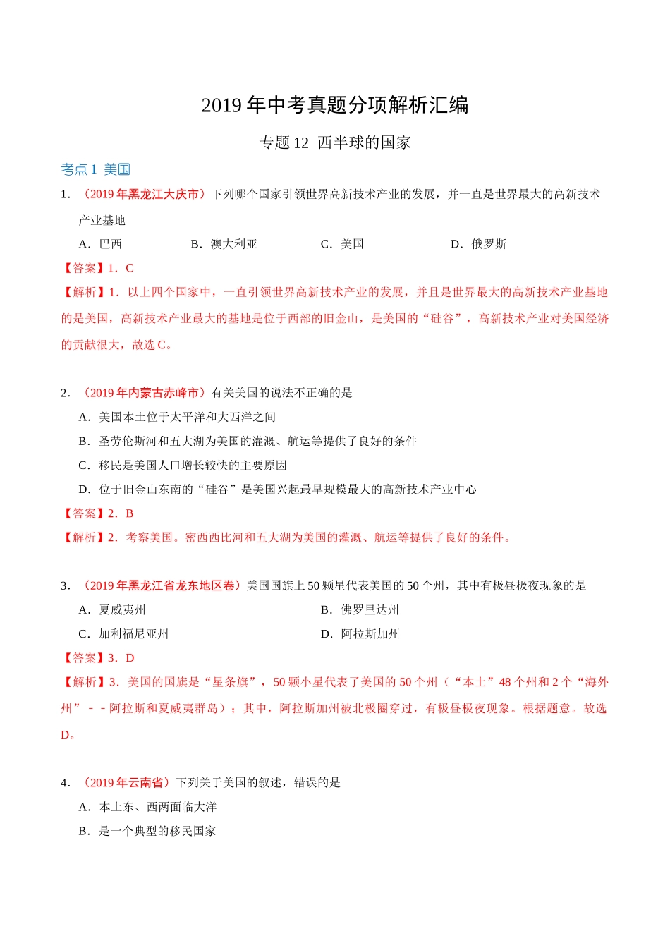 2019年中考真题分项解析汇编专题12西半球的国家考点1美国1.(2019年黑龙江大庆市)下列哪个国家引领世界高新技术产业的发展,并一直是世界最大的高新技术产业基地A.巴西B.澳大利亚C.美国D.俄罗斯【答案】1....