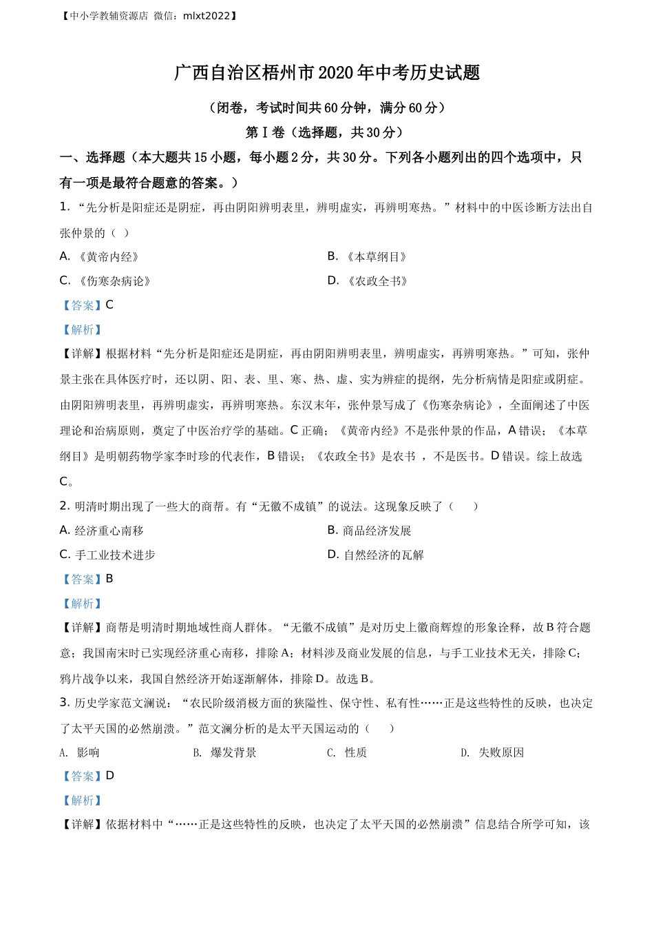 【中小学教辅资源店微信:mlxt2022】广西自治区梧州市2020年中考历史试题(闭卷,考试时间共60分钟,满分60分)第Ⅰ卷(选择题,共30分)一、选择题(本大题共15小题,每小题2分,共30分。下列各小题列出的四个选...