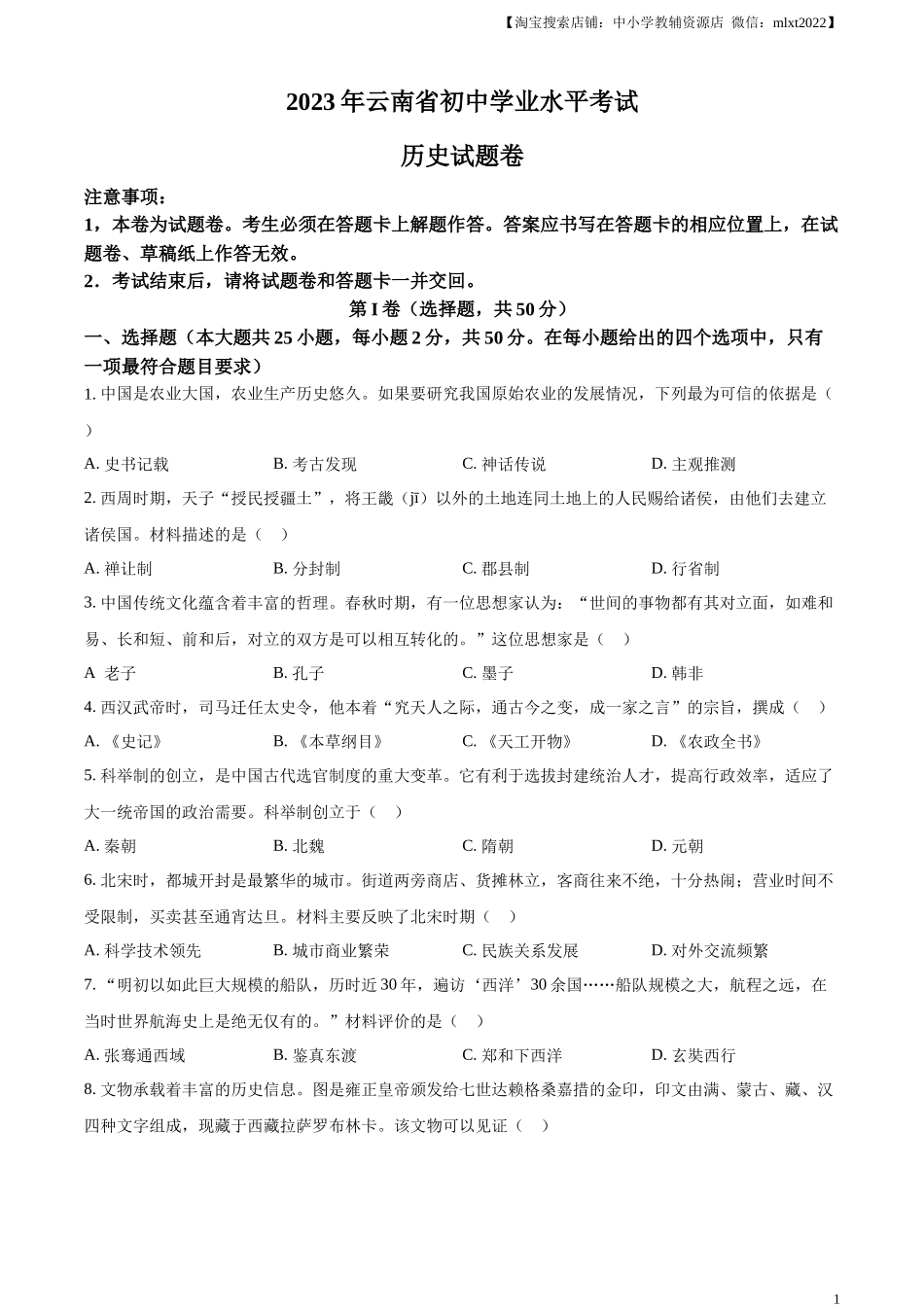 【淘宝搜索店铺:中小学教辅资源店微信:mlxt2022】2023年云南省初中学业水平考试历史试题卷注意事项:1,本卷为试题卷。考生必须在答题卡上解题作答。答案应书写在答题卡的相应位置上,在试题卷、草稿纸上作答无...