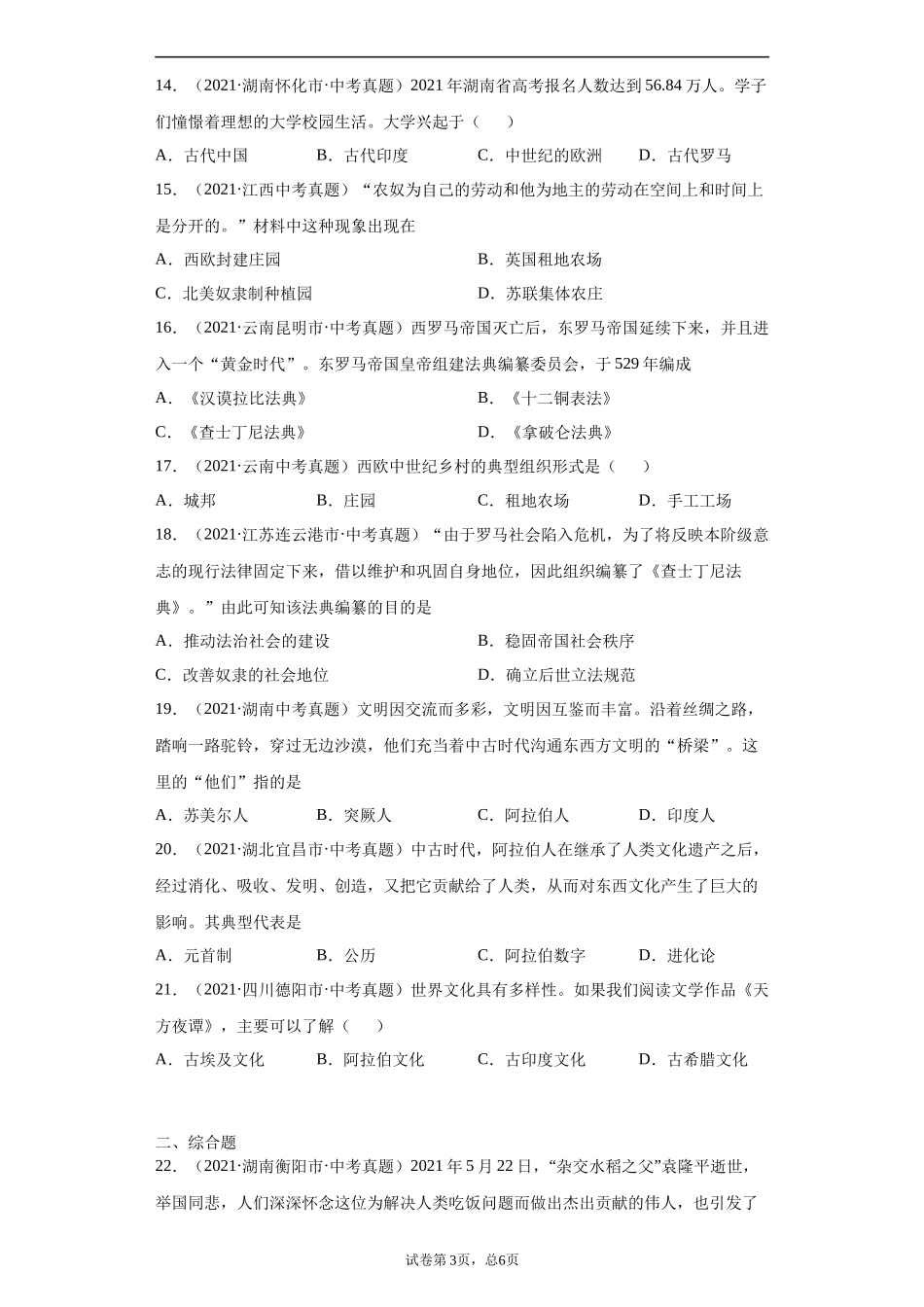 专题21封建时代的欧洲和亚洲国家一、选择题1.(2021·湖南长沙市·中考真题)在西欧,庄园为领主提供面粉、蔬菜等,也为领主提供衣物。庄园有铁匠、金银匠、鞋匠等各类工匠,可以制造不同的物品,是一个农业和手...
