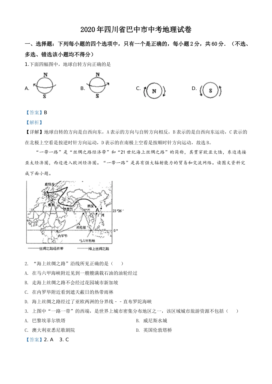 2020年四川省巴中市中考地理试卷一、选择题:下列每小题的四个选项中,只有一个是正确的,每小题2分,共60分.(不选、多选、错选该小题均不得分)1.下面四幅图中,地球自转方向正确的是A.B.C.D.【答案】B【解析...