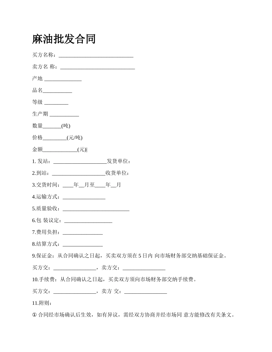 麻油批发合同买方名称:____________________________卖方名称:____________________________产地______________品名___________等级_________生产期___________数量_______(吨)价格_________(元/吨)金额_______...