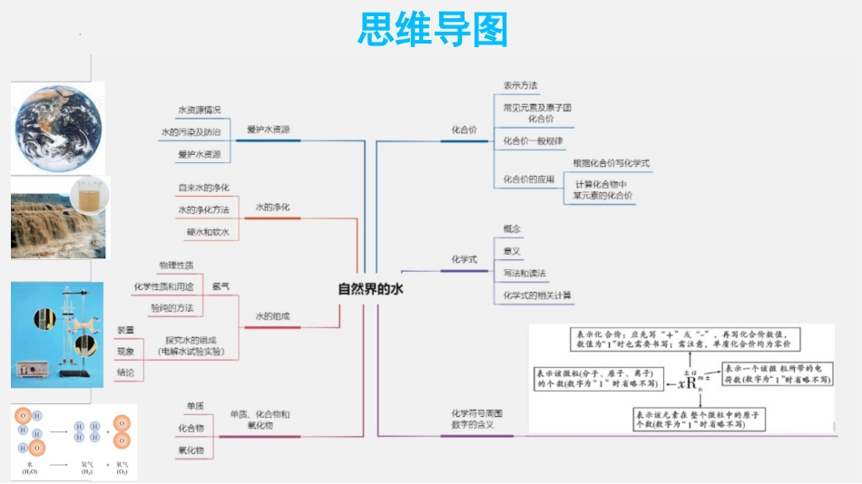 第四单元自然界的水【单元复习】思维导图爱护水资源考点一爱护水资源物理性质无色、无味的液体,4℃时ρ=1ɡ/cm3,分布储量分布:地面水,地下水,大气水,生物水,其中地球表面71%被水覆盖,但供人类利用的淡水...