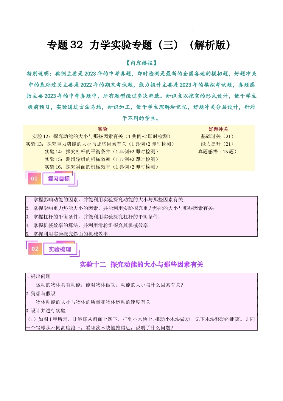 专题32力学实验专题(三)(解析版)【内容播报】特别说明:典例主要是2023年的中考真题,即时检测是最新的全国各地的模拟题,好题冲关中的基础过关主要是2022年的期末考试题,能力提升主要是2023年的模拟考试题...
