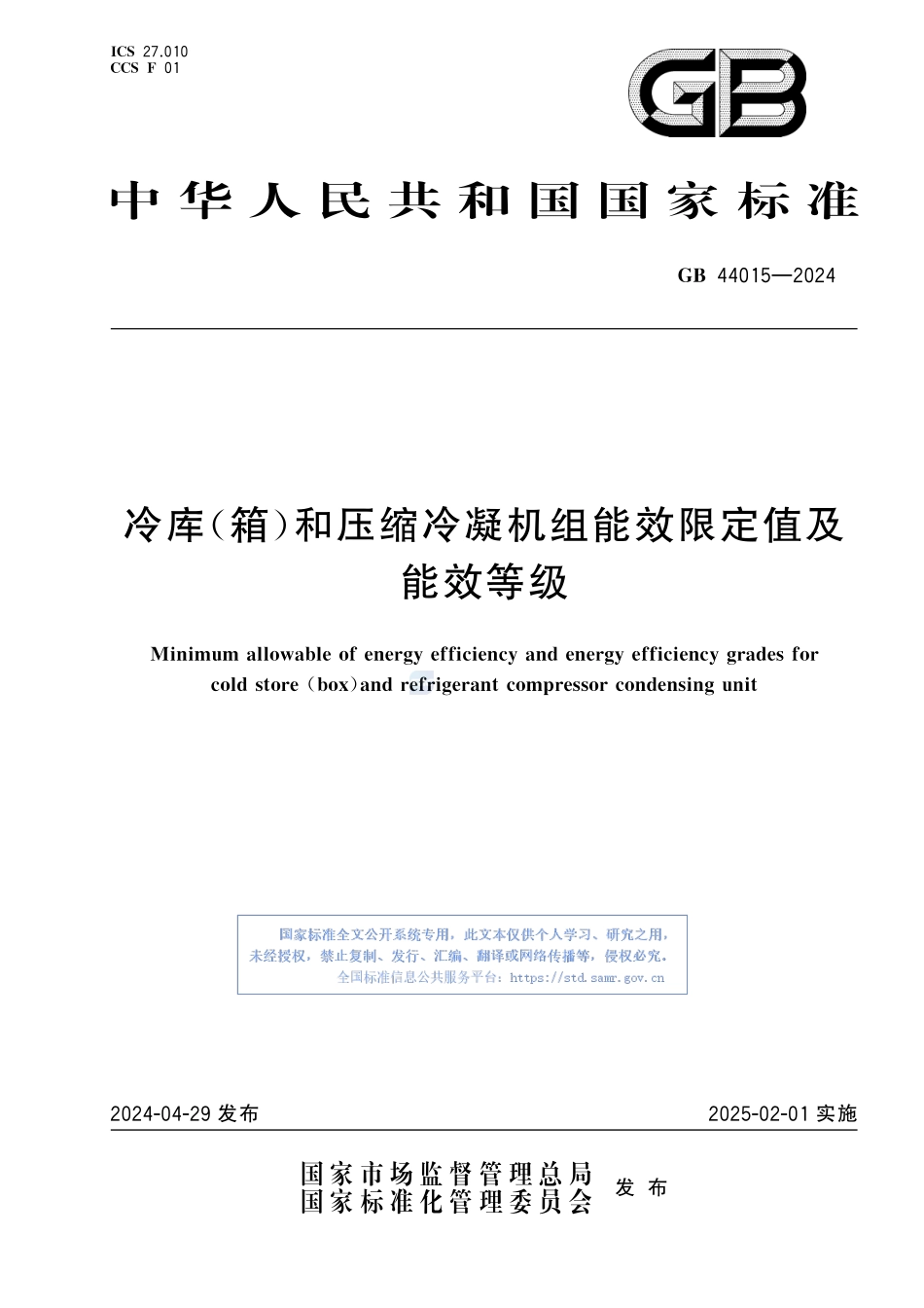 GB+44015-2024 冷库(箱)和压缩冷凝机组能效限定值及能效等级.pdf