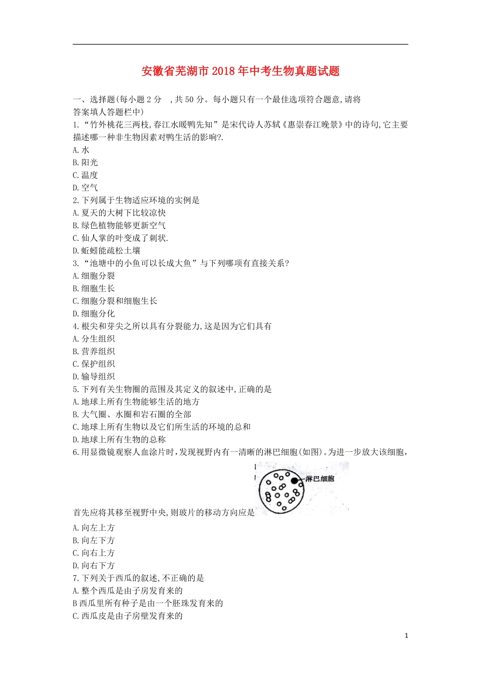 安徽省芜湖市2018年中考生物真题试题(含答案).pdf_第1页