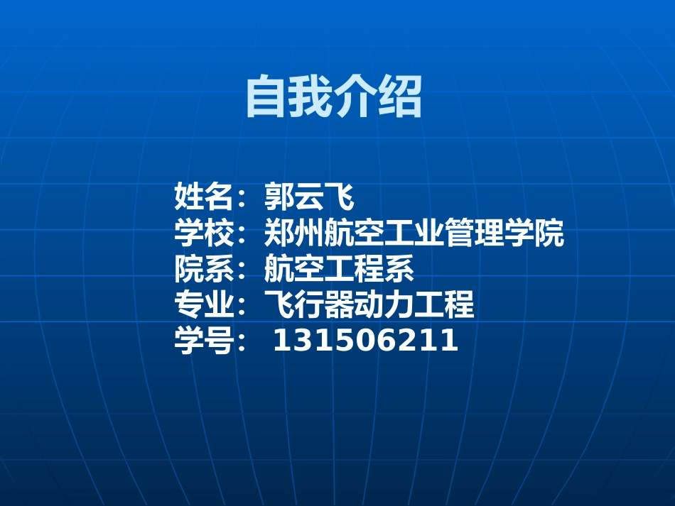 职业生涯规划书自我介绍姓名:郭云飞学校:郑州航空工业管理学院院系:航空工程系专业:飞行器动力工程学号:131506211目录一.引言二.自我分析三.职业分析四职业定位五.计划实施方案六评估调整七.结语一引言不少...
