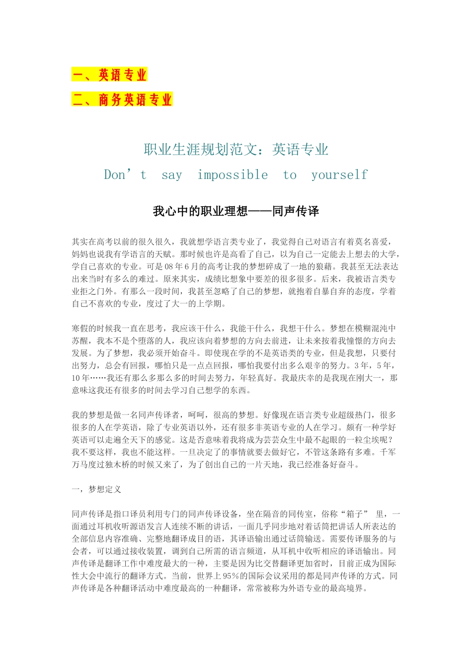一、英语专业二、商务英语专业职业生涯规划范文:英语专业Don’tsayimpossibletoyourself我心中的职业理想——同声传译其实在高考以前的很久很久,我就想学语言类专业了,我觉得自己对语言有着莫名喜爱,妈妈也说...