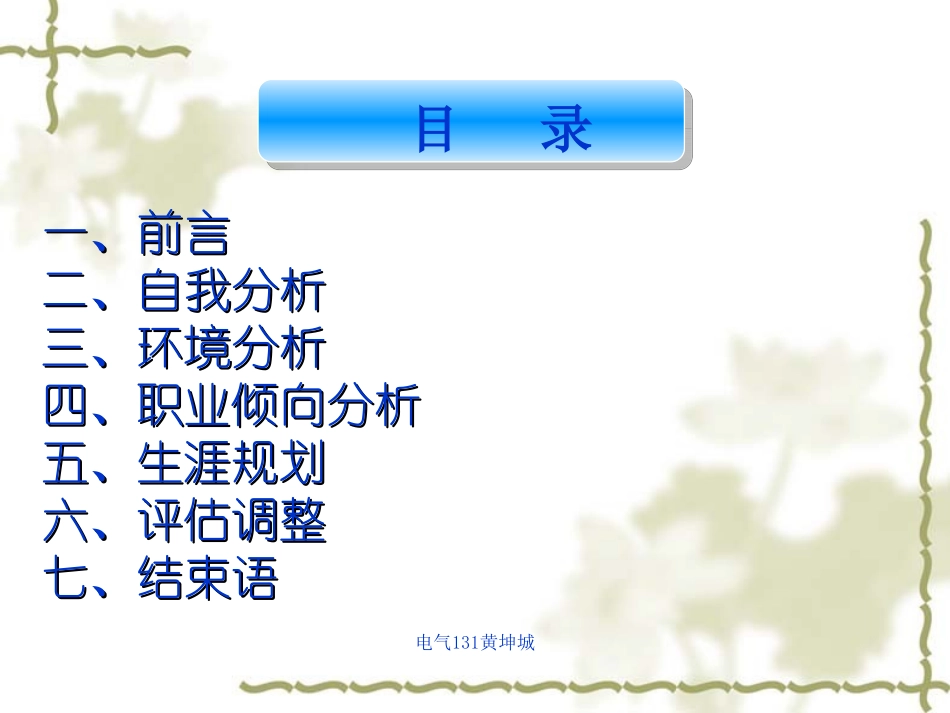 电气131黄坤城大学生生涯职业规划书学院:莆田学院院系:机电工程学院班级:电气131姓名:黄坤城电气131黄坤城目录一、前言一、前言二、自我分析二、自我分析三、环境分析三、环境分析四、职业倾向分析四、职业倾...