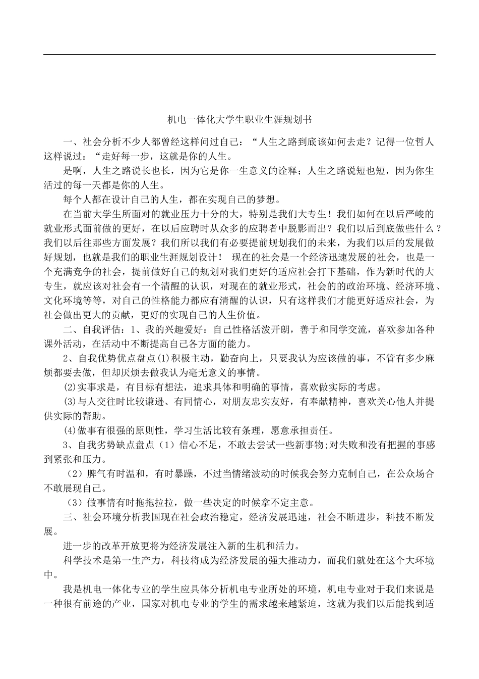 机电一体化大学生职业生涯规划书一、社会分析不少人都曾经这样问过自己:“人生之路到底该如何去走?记得一位哲人这样说过:“走好每一步,这就是你的人生。是啊,人生之路说长也长,因为它是你一生意义的诠释;...