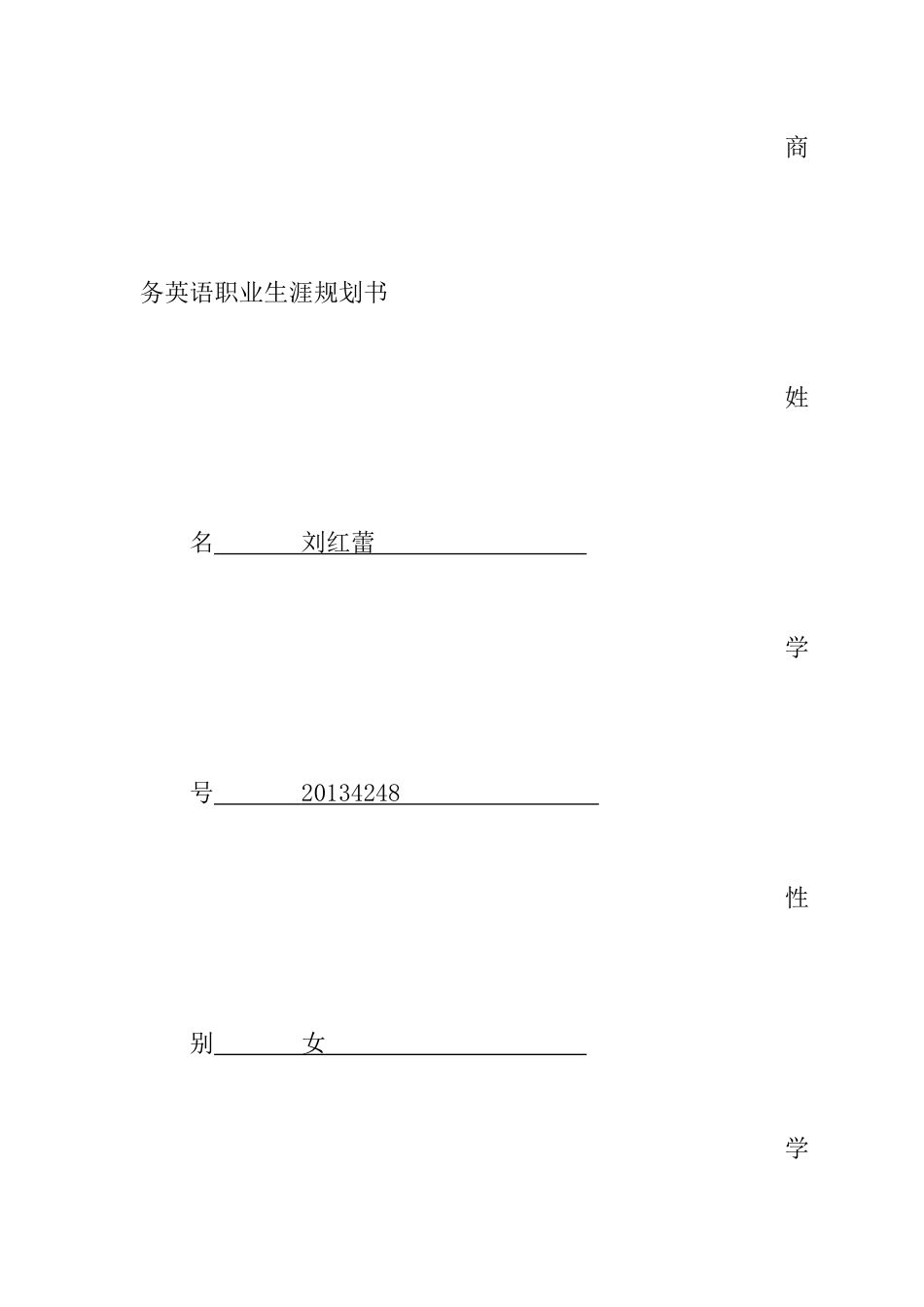 商务英语职业生涯规划书姓名刘红蕾学号20134248性别女学院外国语学院专业商务英语年级2013级联系电话13079516842E—mail1454238914@qq.com商务英语专业大学生职业生涯规划书第一部分自我认知分析1.1职业兴趣我是...