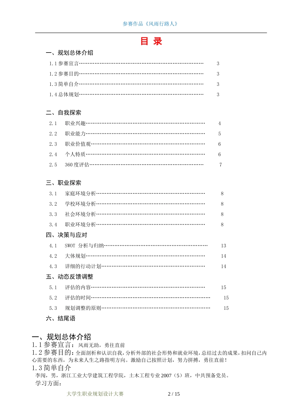 参赛作品《风雨行路人》职业生涯规划设计书——风雨行路人姓名:李闯性别:男出生:1987、06学校:浙江工业大学院系:建筑工程学院土木工程专业手机:15858257800电子邮件:lichuang5577@126.com撰写时间:2009年...