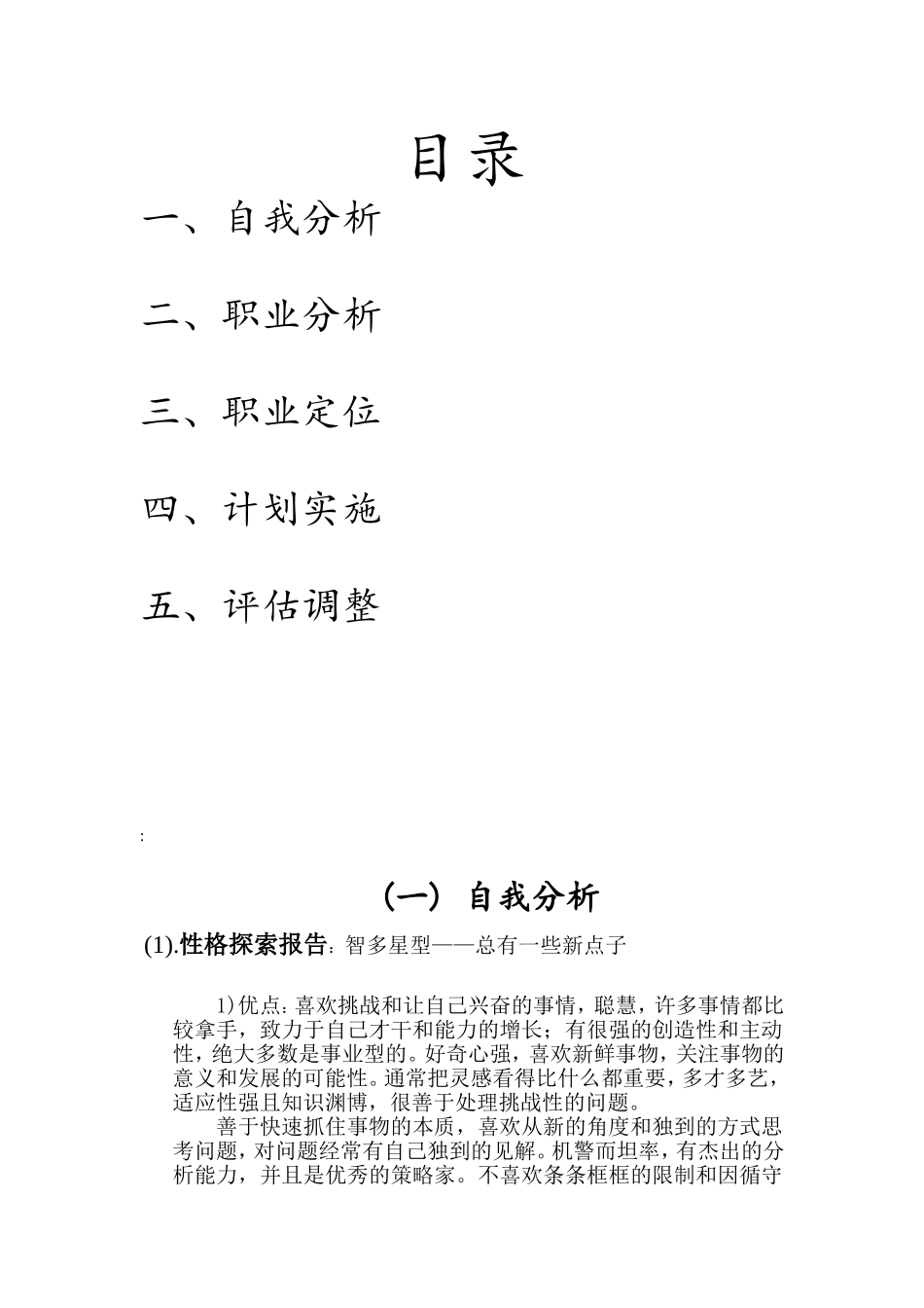目录一、自我分析二、职业分析三、职业定位四、计划实施五、评估调整:(一)自我分析(1).性格探索报告:智多星型——总有一些新点子1)优点:喜欢挑战和让自己兴奋的事情,聪慧,许多事情都比较拿手,致力于自己才干...