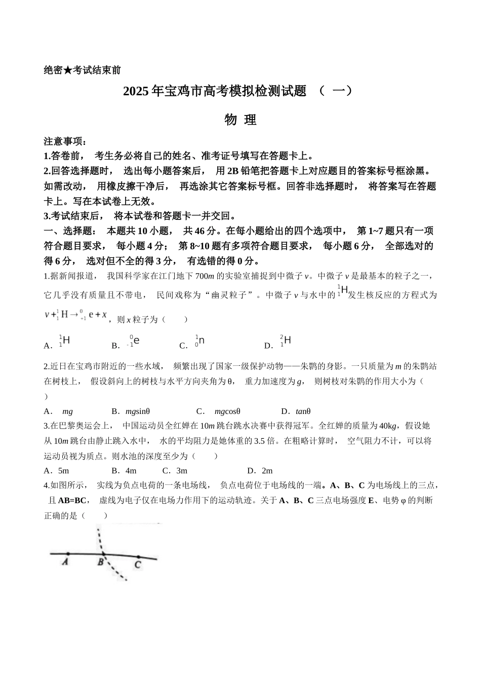 绝密★考试结束前2025年宝鸡市高考模拟检测试题(一)物理注意事项:1.答卷前,考生务必将自己的姓名、准考证号填写在答题卡上。2.回答选择题时,选出每小题答案后,用2B铅笔把答题卡上对应题目的答案标号框涂黑...