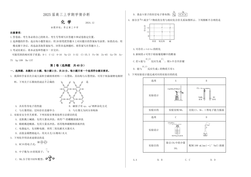 2025届高三上学期学情诊断化学2024.12命题学校:枣庄第三中学注意事项:1.答卷前,考生务必将自己的姓名、考生号等填写在答题卡和试卷指定位置。2.选择题的作答:选出每小题答案后,用2B铅笔把答题卡上对应题目的...