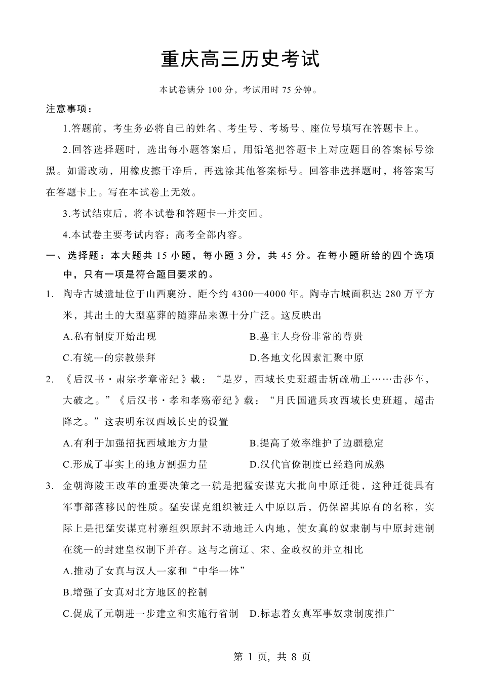 重庆高三历史考试本试卷满分100分,考试用时75分钟。注意事项:1.答题前,考生务必将自己的姓名、考生号、考场号、座位号填写在答题卡上。2.回答选择题时,选出每小题答案后,用铅笔把答题卡上对应题目的答案标号...